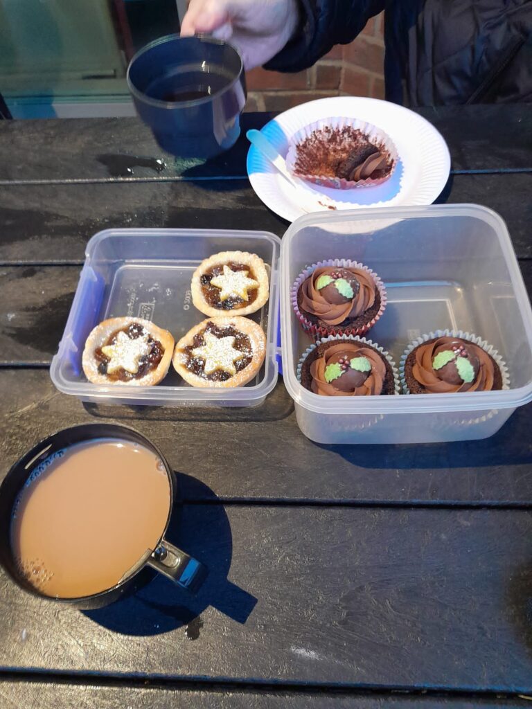 After about an hour and a half the team had achieved what they set out to do and returned to base for refreshments of home made cakes and mince pies (made by Andy’s wife Tracy) and hot drinks provided by Andy.